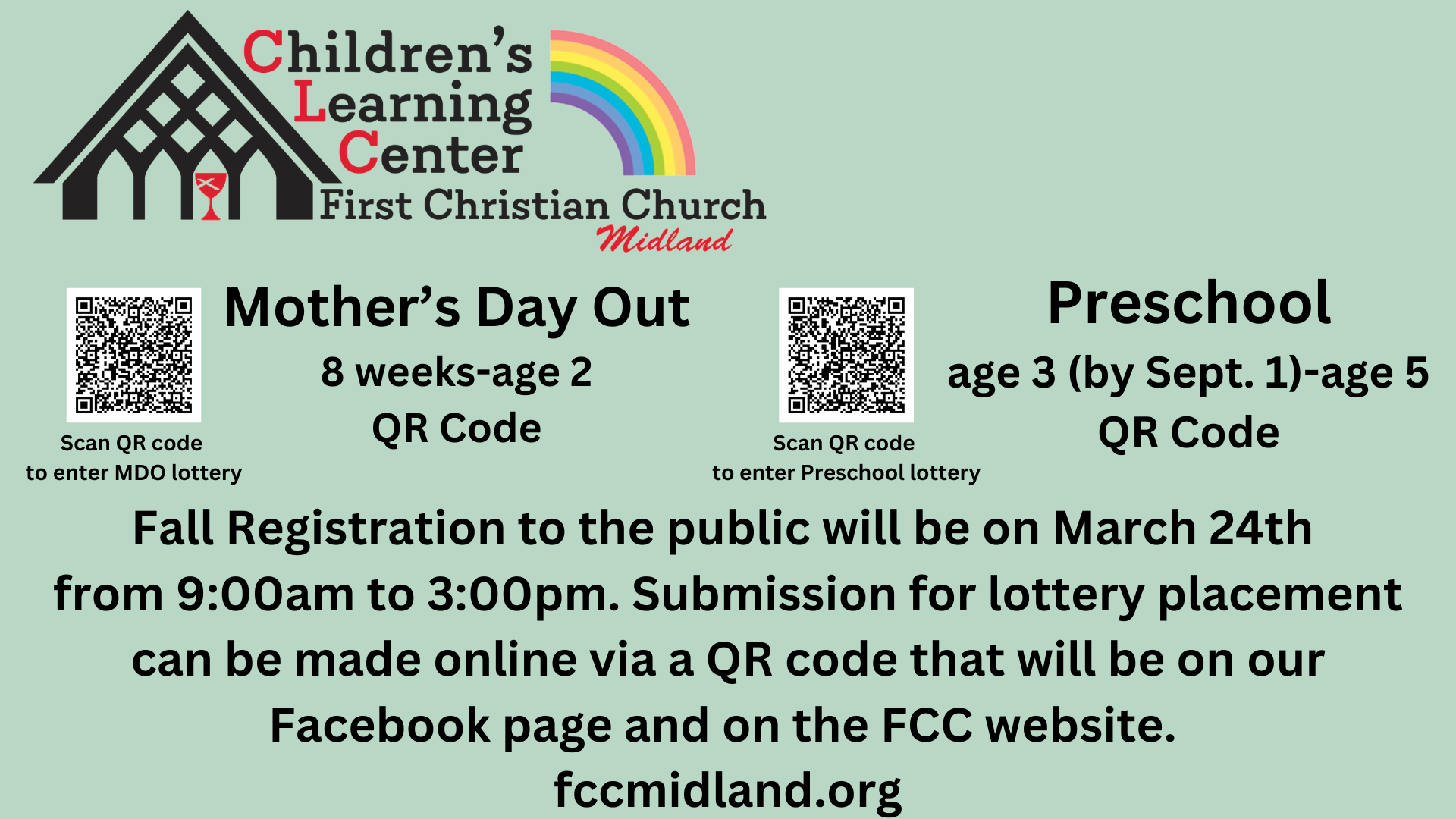 The Children’s Learning Center is a Mother’s Day Out/Preschool program located on the campus of First Christian Church at 1301 W. Louisiana in Midland. Our united program includes children from 8 weeks – to 4 years of age, children up to age 12 can attend during the summer program. We offer classes for students with learning differences or special needs.